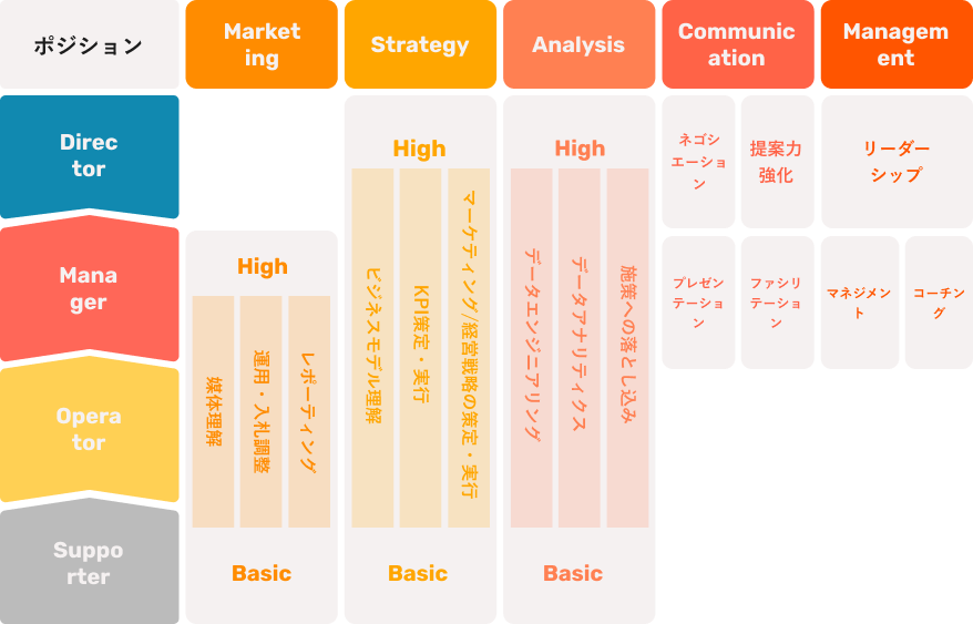 業界、ビジネスモデル、運用媒体ごとに蓄積しておくべきスキル・ナレッジの習得を目指したトレーニングを行います。